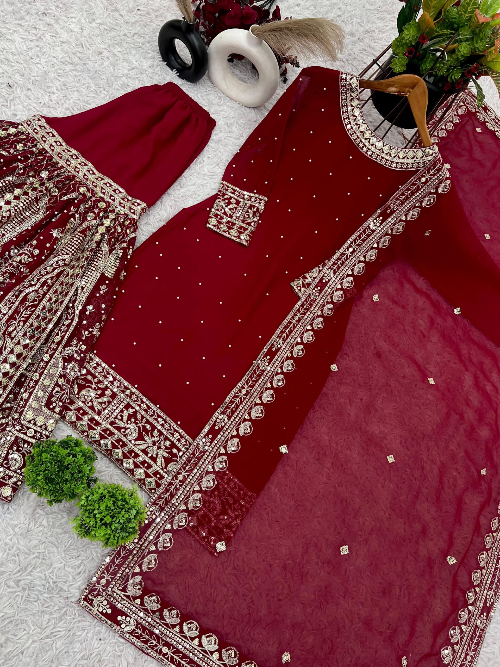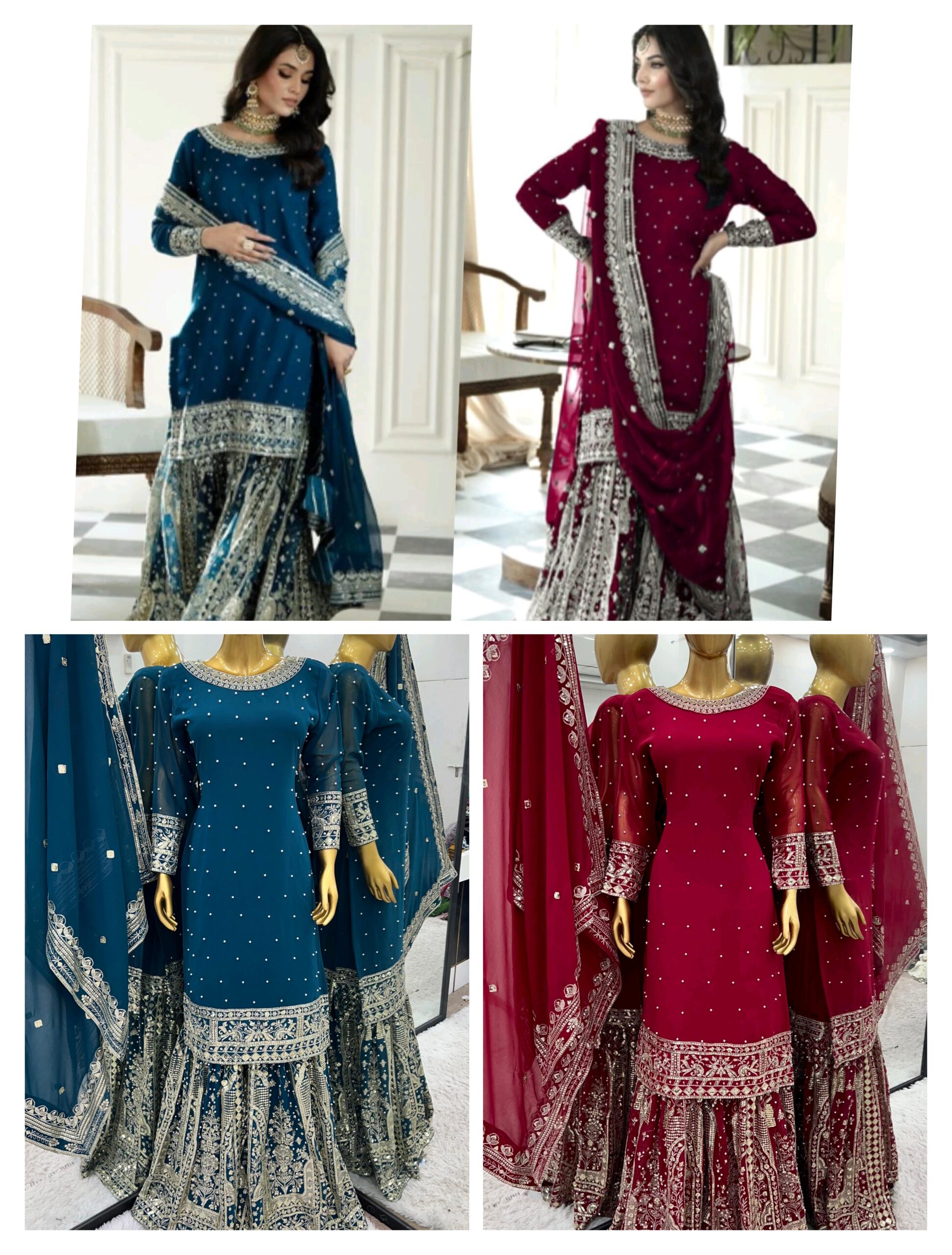 *GHARARA FABRICS* :HEAVY FAUX GEORGETTE WITH FULL *HEAVY EMBROIDERY SEQUENCE WORK WITH RIVET MOTI WORK*